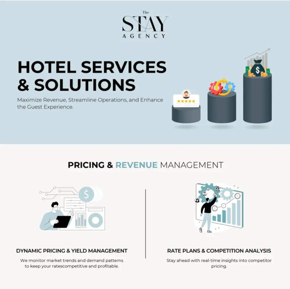 At The Stay Agency , we’re more than just a service provider—we’re your dedicated partner in hospitality success. Born from a passion for the hotel industry and a deep understanding of its unique challenges, our team combines years of expertise in revenue management, hotel operations, and digital marketing to drive measurable results for your property.