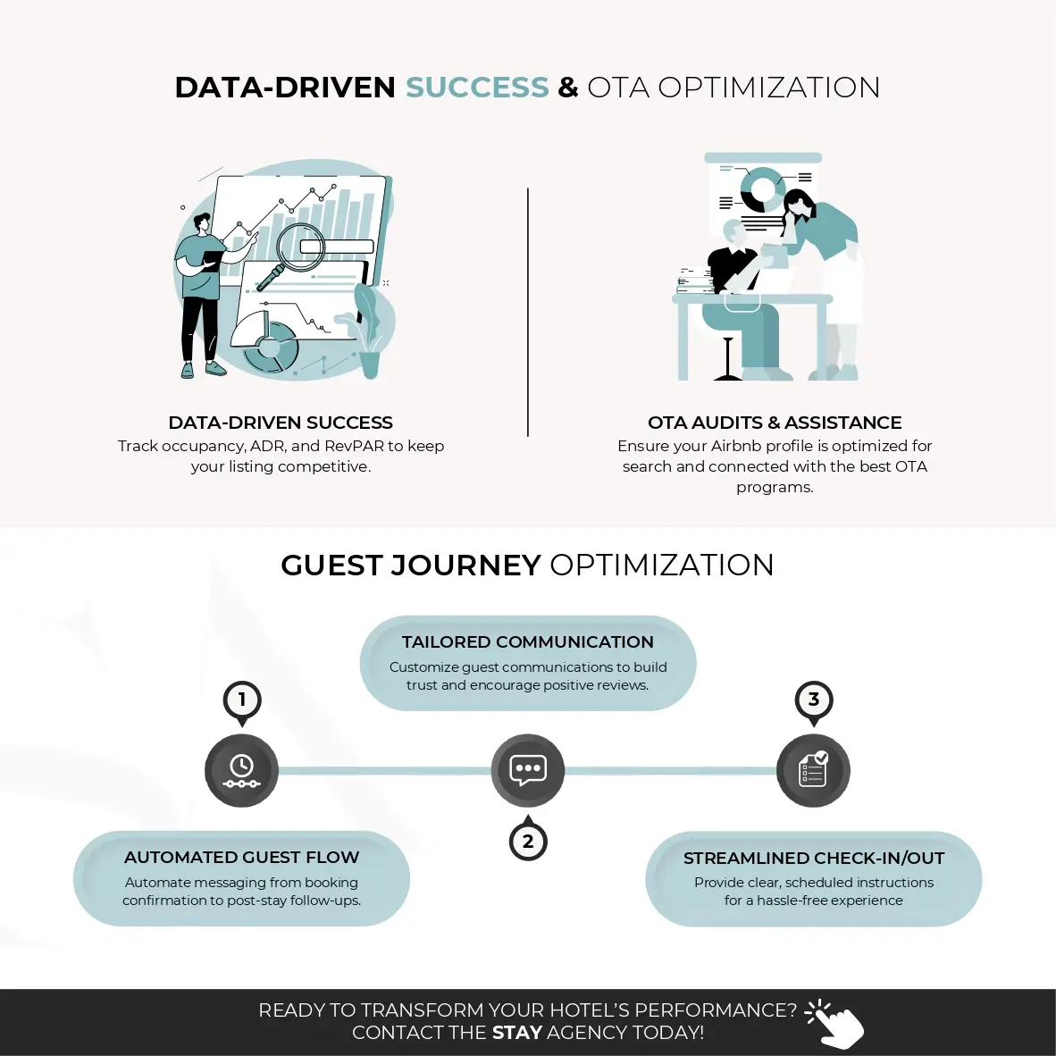 Each property has unique needs, and the OTAs you choose can have a major impact on your visibility. We offer recommendations on the best OTAs and programs to enroll in, ensuring maximum exposure while maintaining your brand’s integrity. Let us guide you in choosing the right OTAs for your business.